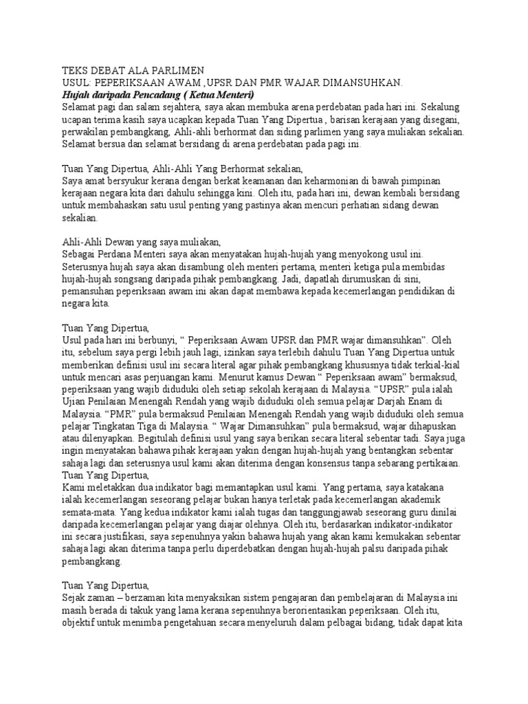 Anda akan menyertai Pertandingan Bahas Ala Parlimen peringkat daerah sebagai pasukan kerajaan. Pasti ramai yang kerap mendengar omelan bahawa debat bukan pidato berkumpulan. Contoh Teks Debat Ala Parlimen - Free download as Word Doc doc docx PDF File pdf Text File txt or read online for free.